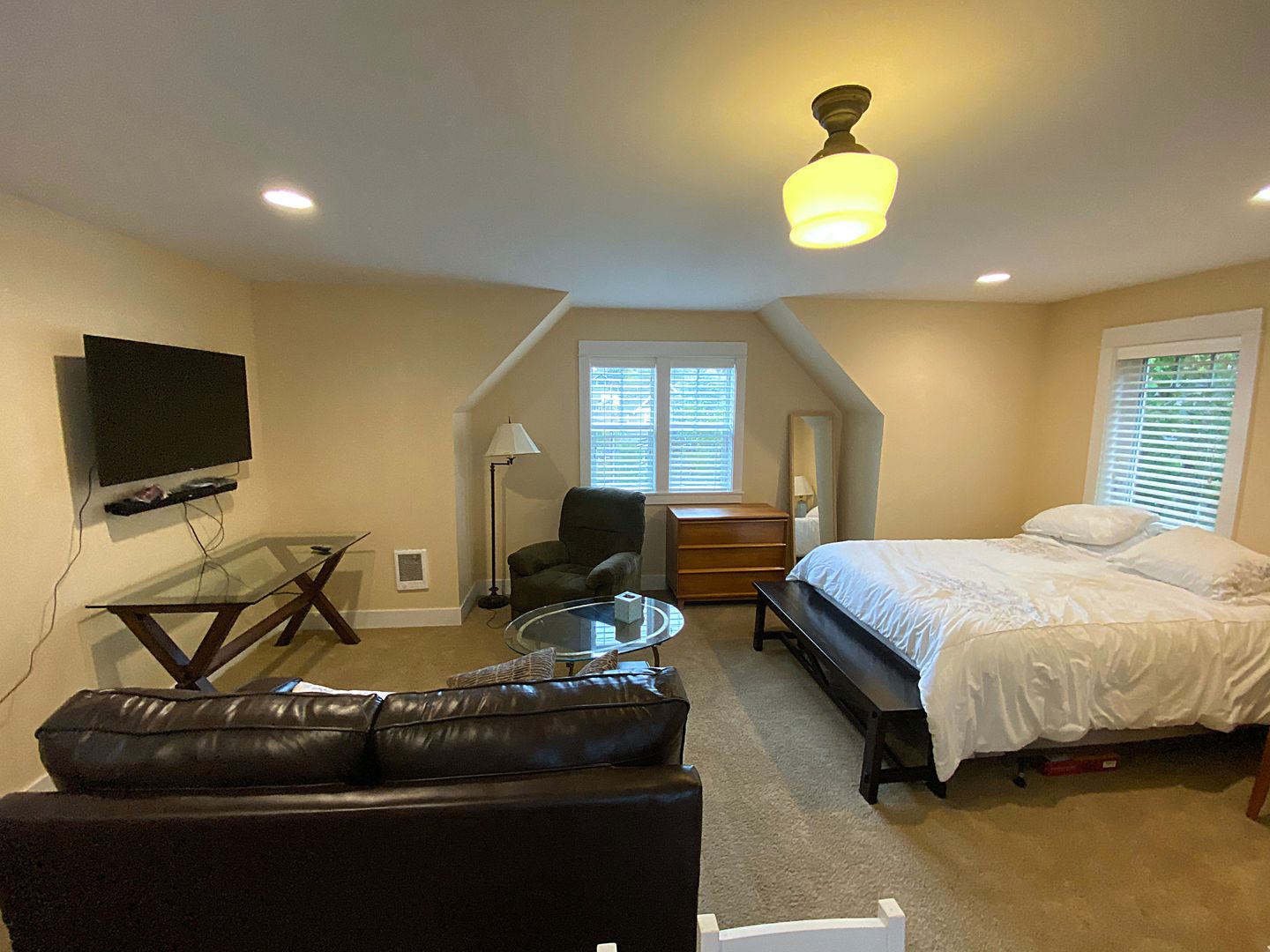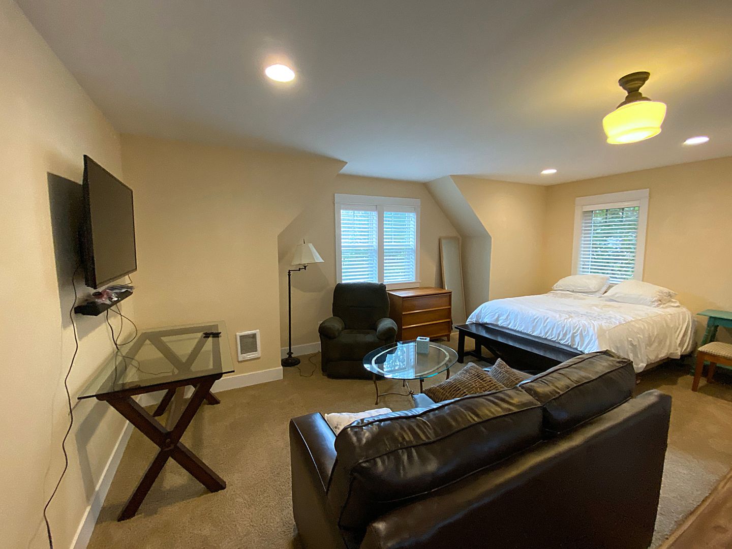 The open studio space has a queen-sized bed, plush carpet, and entertainment area.