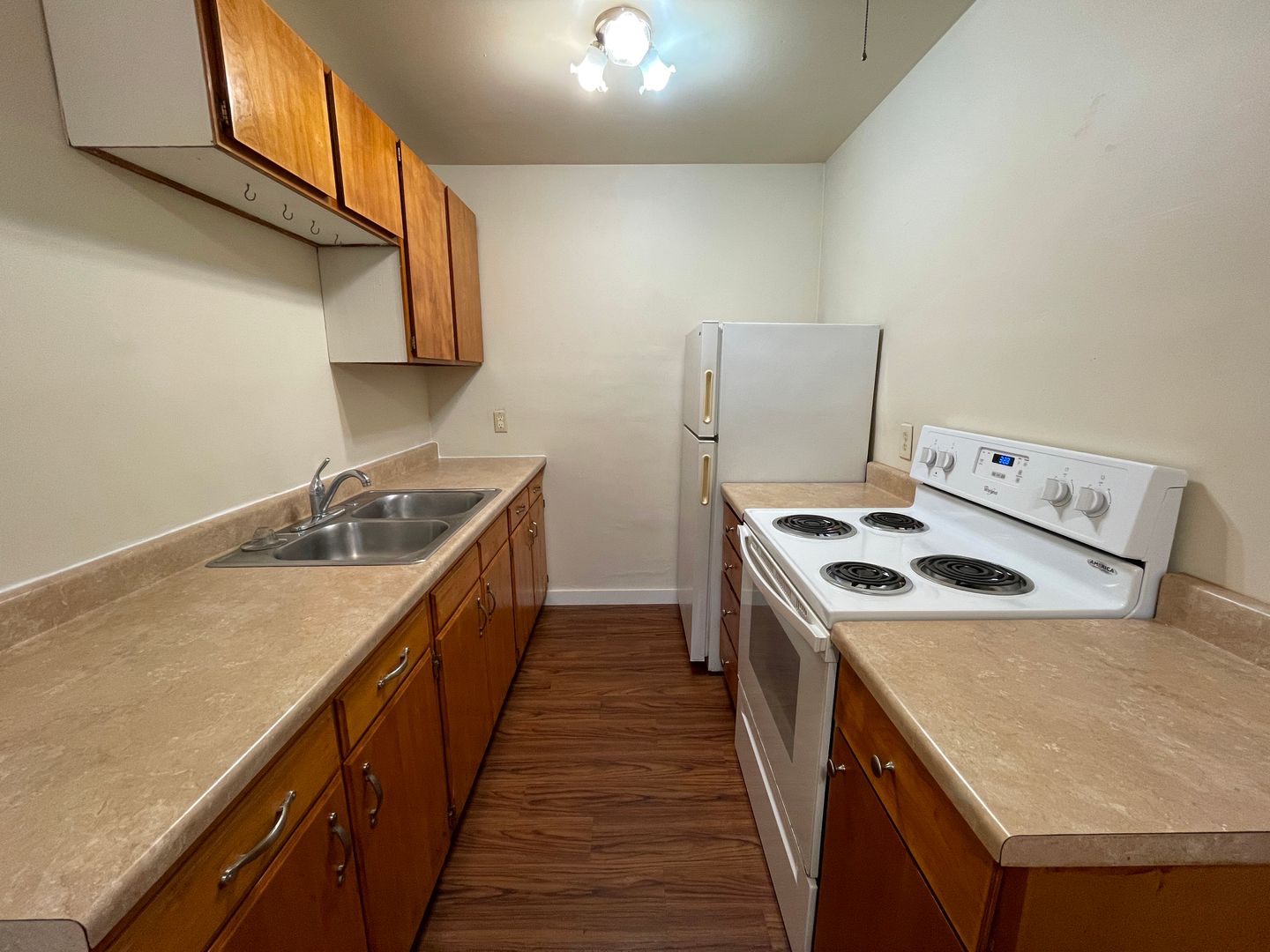 The full kitchen has upper and lower cabinet space, an oven/range, and fridge.
