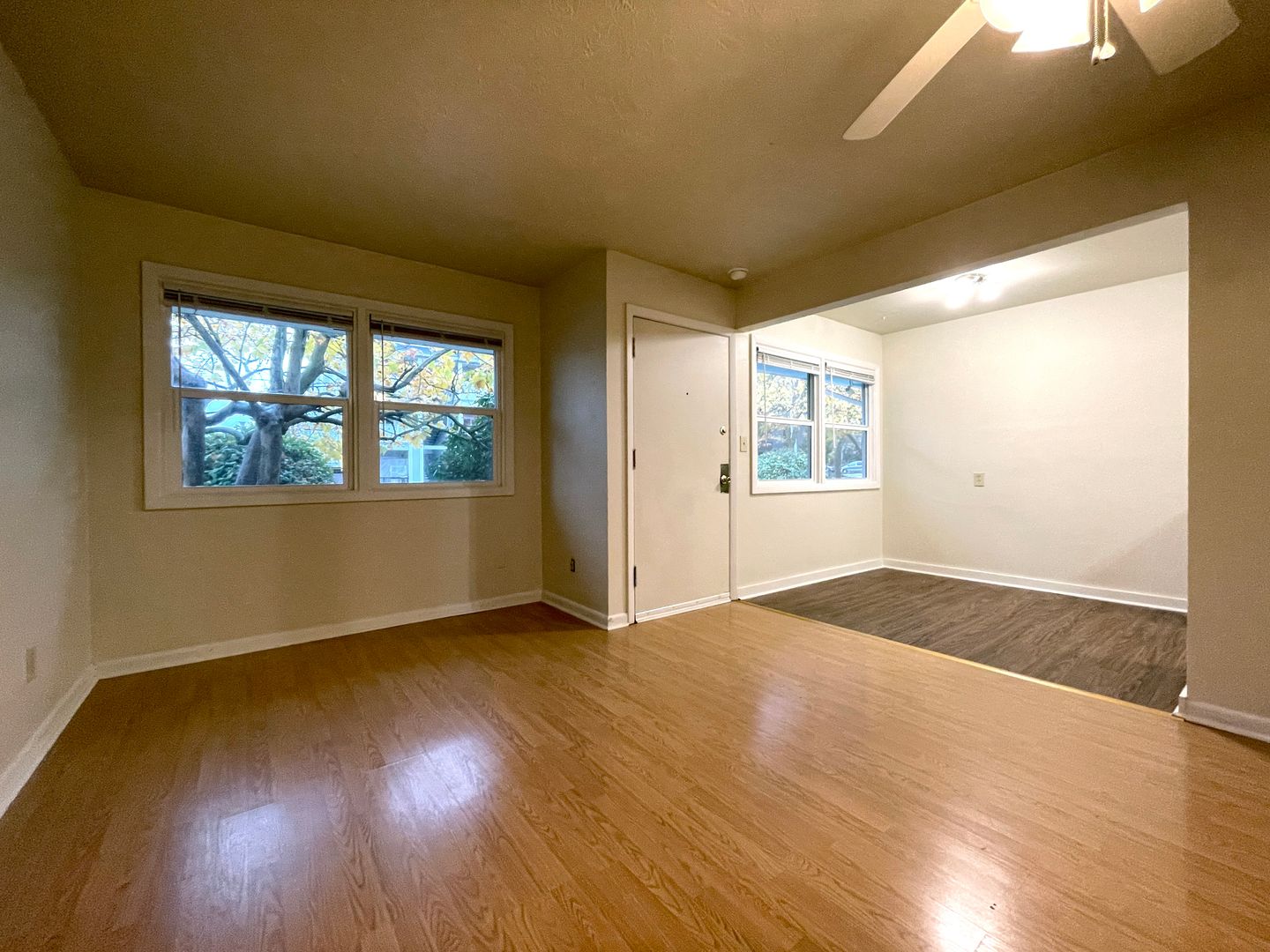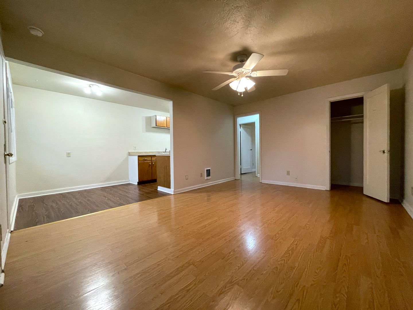 Step into the bright living space, with a dining nook and kitchen. There is a ceiling fan in the main living area. One closet in the living room.