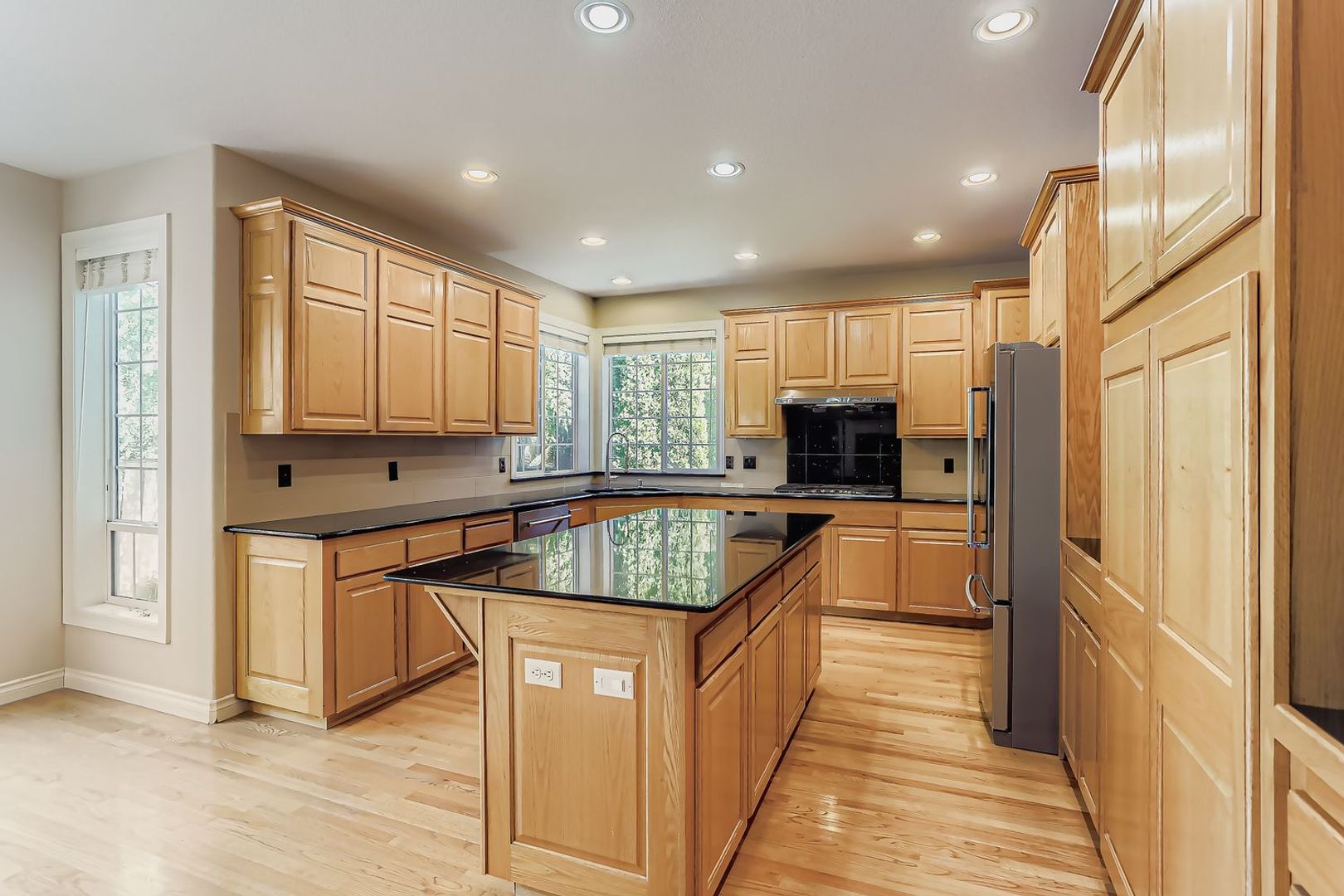 Stainless steel kitchen appliances include a dishwasher, disposal, refrigerator with ice maker, gas range, oven, and built-in microwave. Enjoy fantastic cabinet storage and counter space, plus a kitchen island and walk-in pantry.
