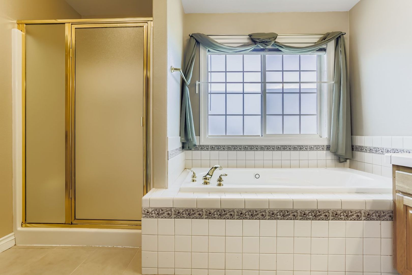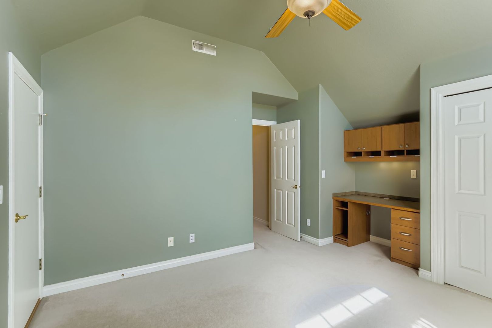 Upstairs, you’ll find a spacious primary suite bedroom with vaulted ceilings and an ensuite bathroom. The attached bathroom features a double-vanity sink, soaking tub, shower, and walk-in closet.