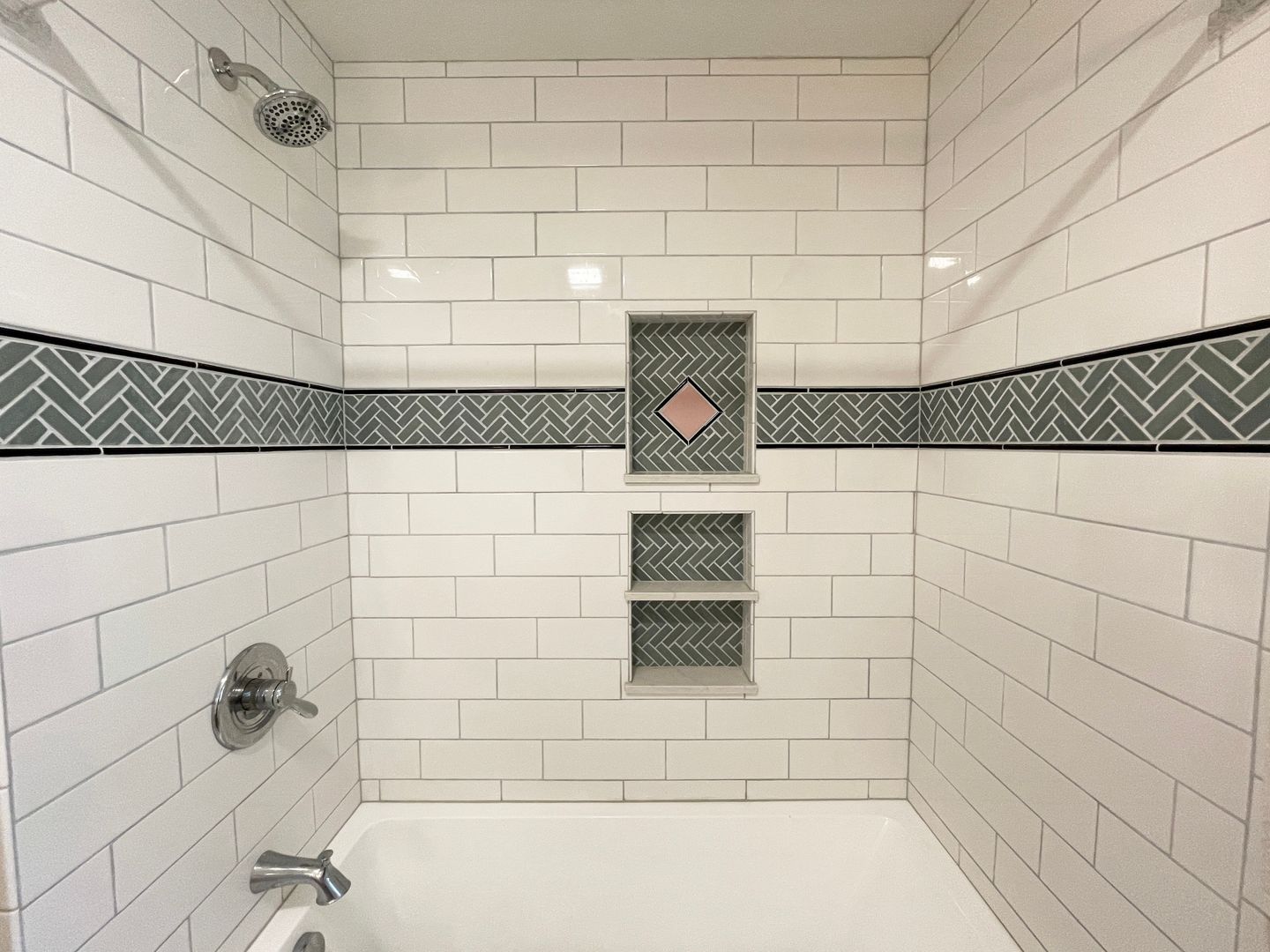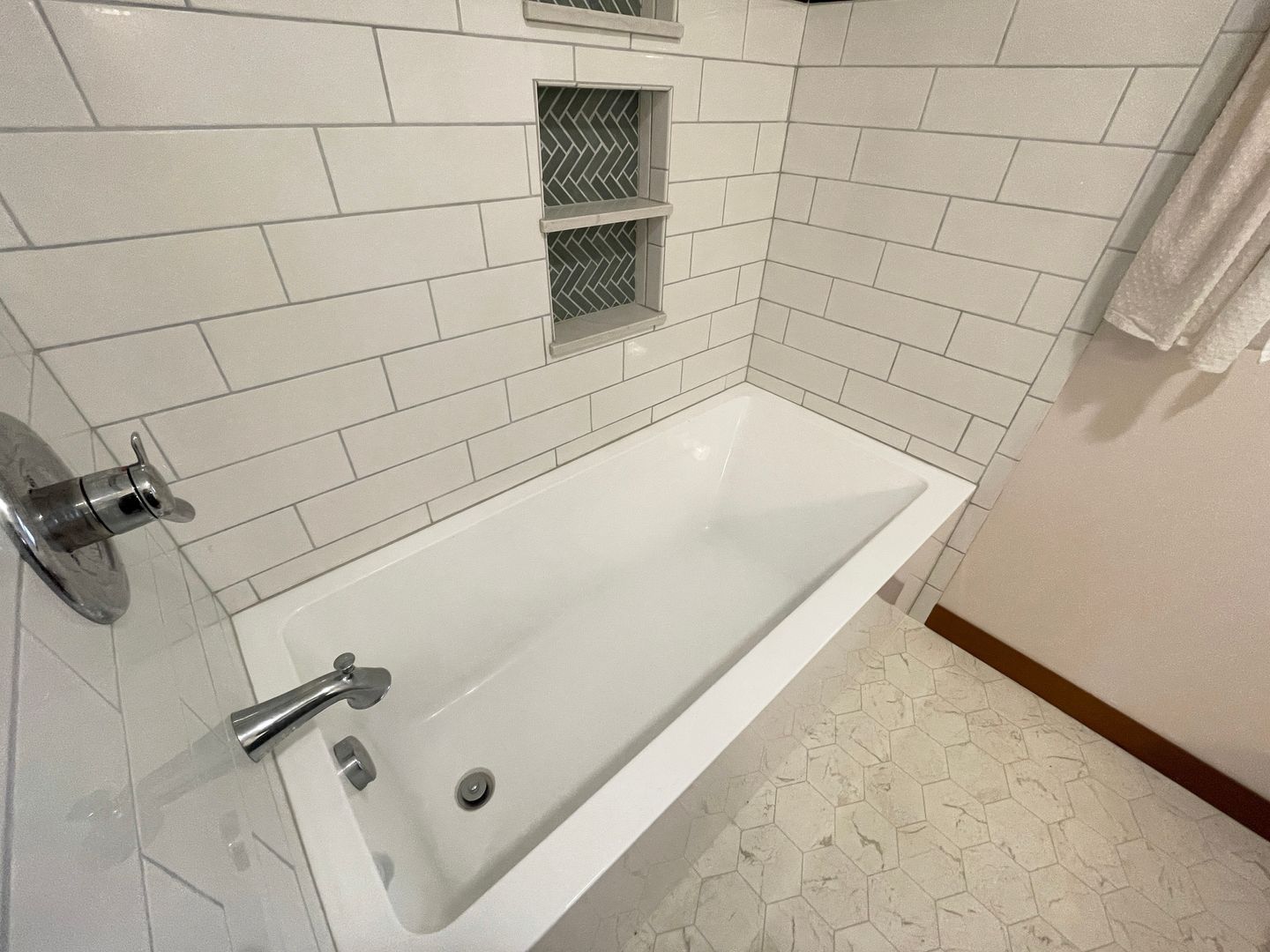 Bathroom has recently been updated with a new tub and gorgeous custom tile shower surround.