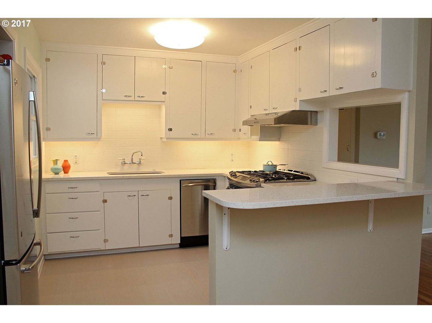 Enter into the living room, which leads to the formal dining room. Kitchen comes equipped with stainless steel refrigerator, dishwasher, disposal, and gas oven/range. Quartz countertops and white cabinets make the space bright.
