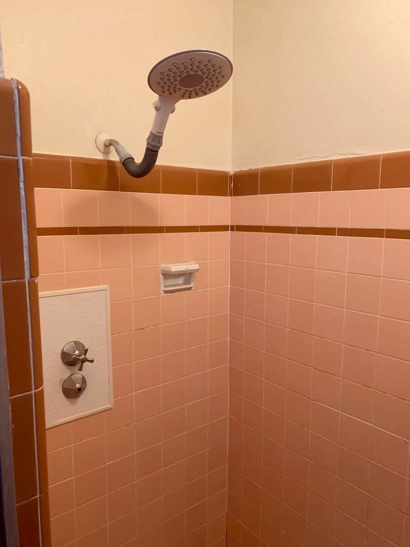 The bathroom is off of the bedroom. Stand up shower with fun retro tiling is in the bathroom.