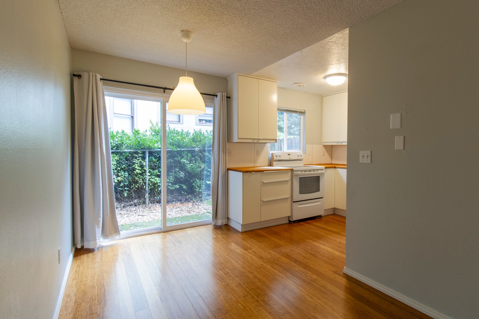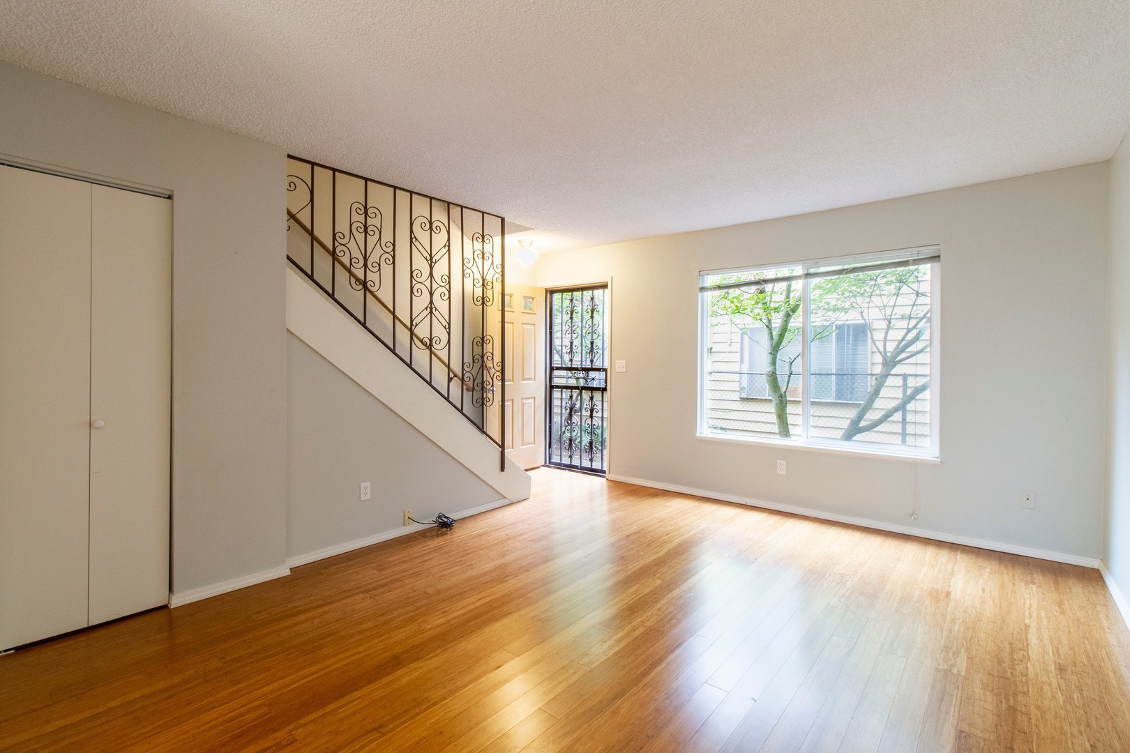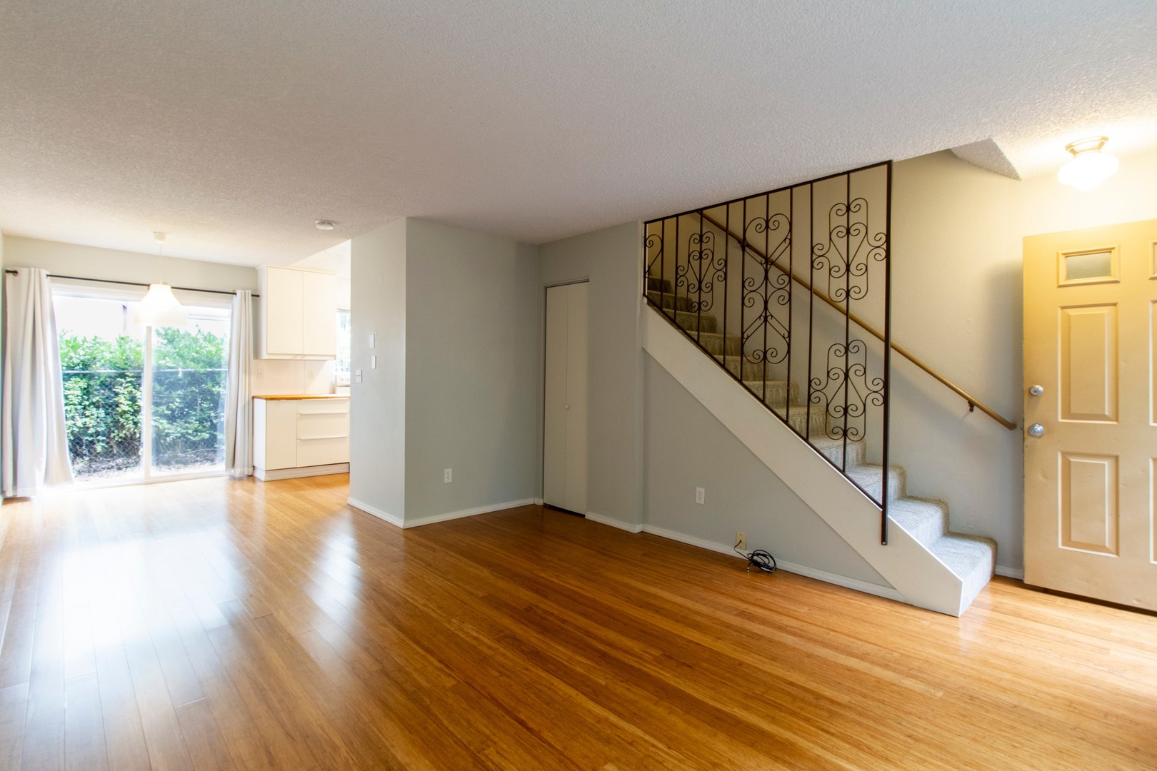 The main floor offers lovely hardwood floors in the living room, a bright dining area with a sliding door to a private patio, and a convenient storage closet under the stairs.