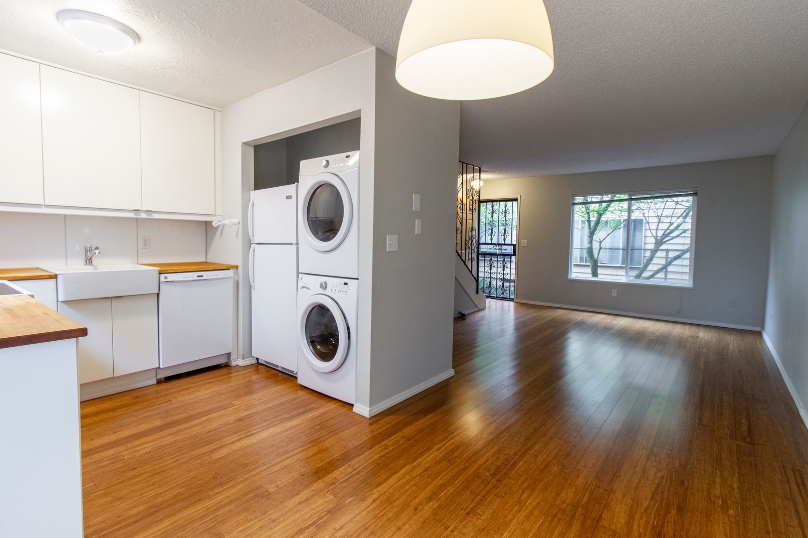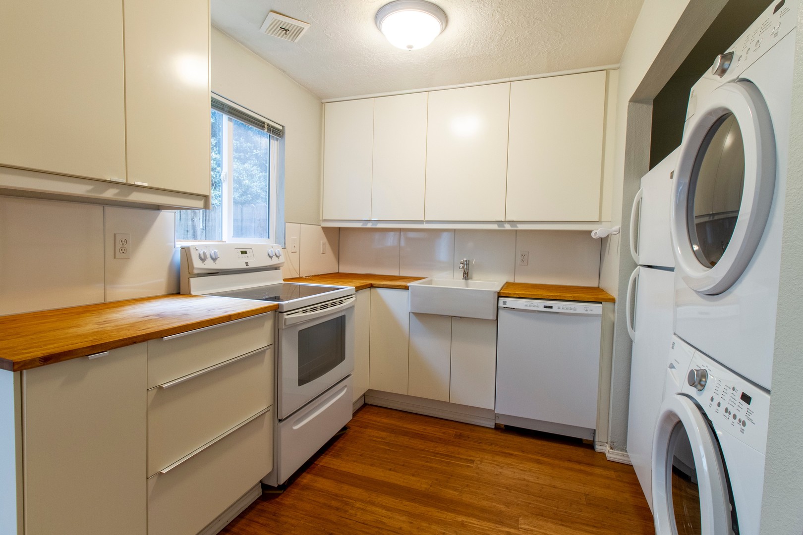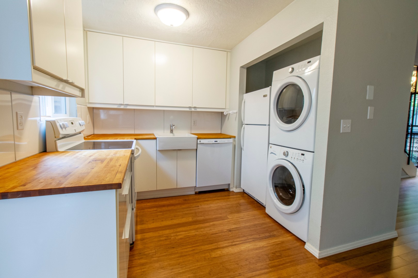 The kitchen features a refrigerator, dishwasher, electric range/oven, and butcher block counters, along with in-unit washer/dryer.