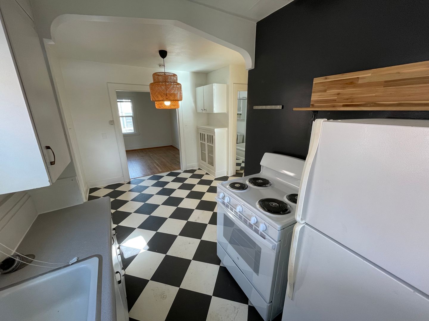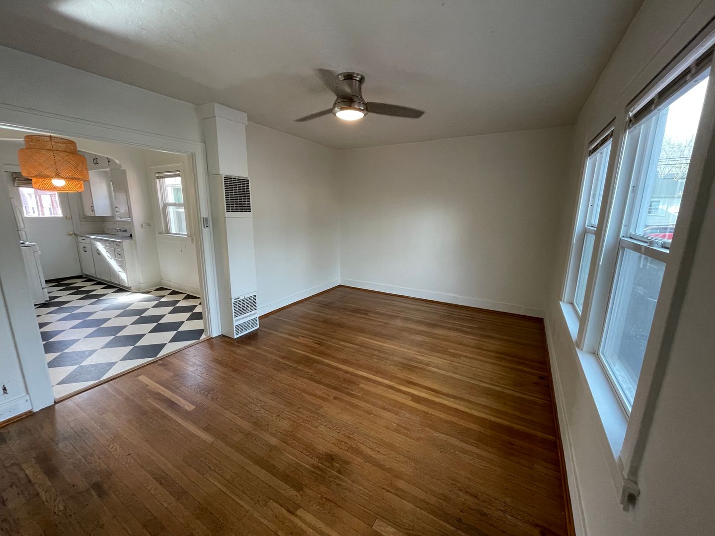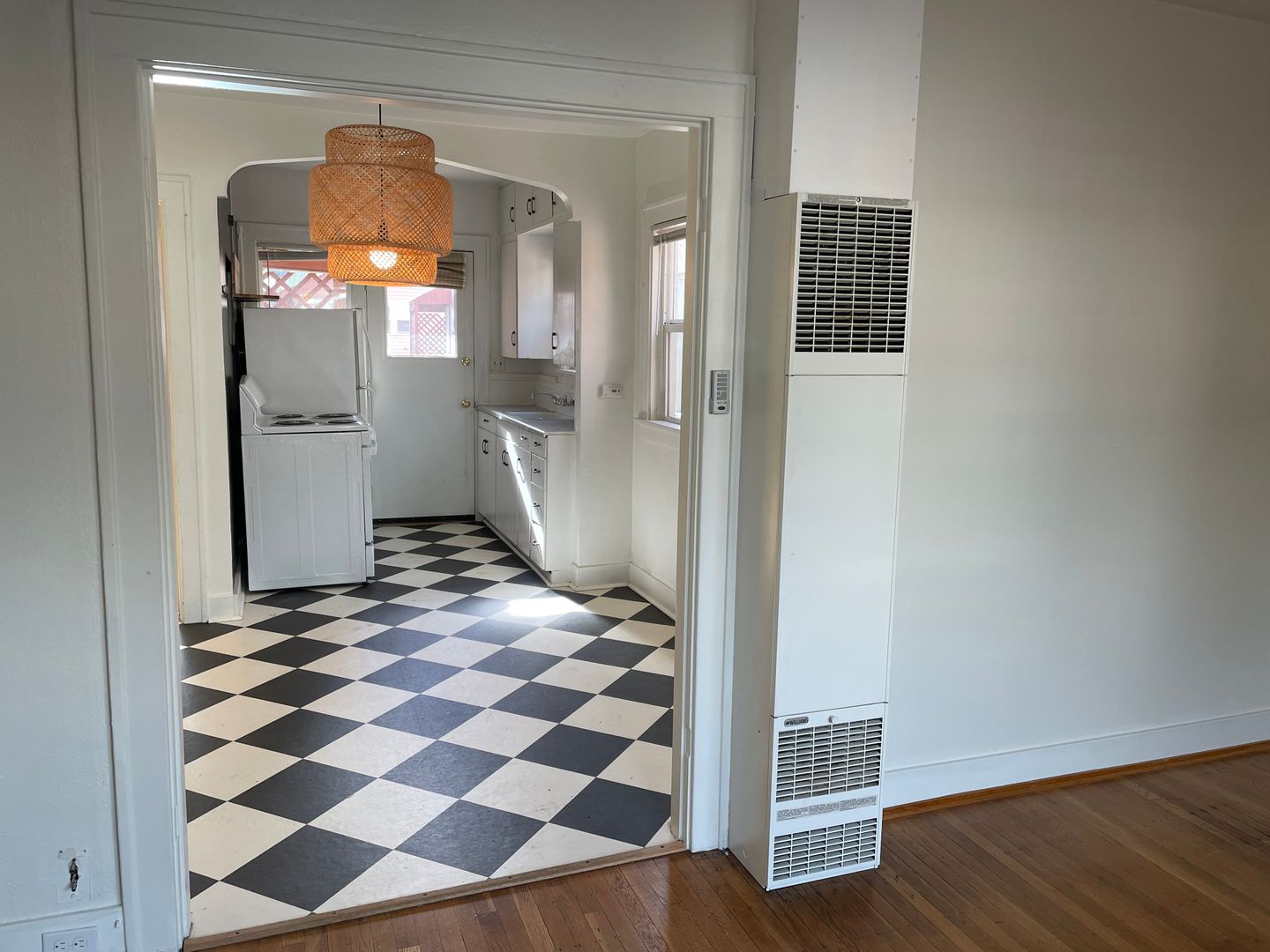 - Original hardwood floors in living and bedroom, and checkered flooring in dining, bathroom and kitchen