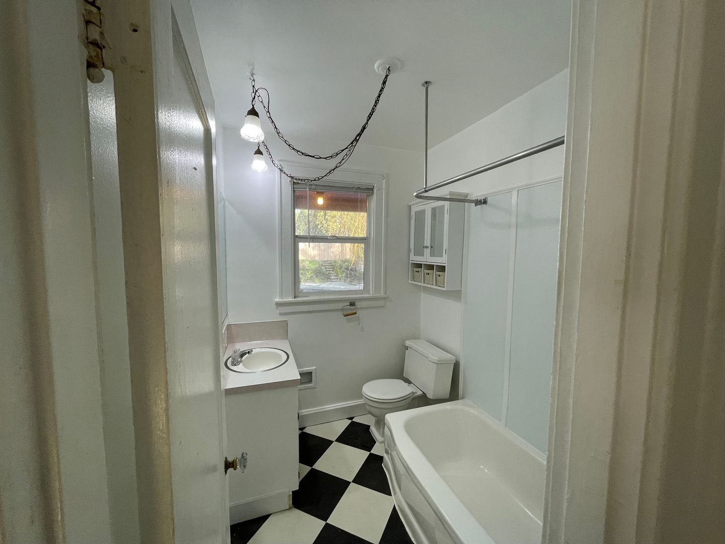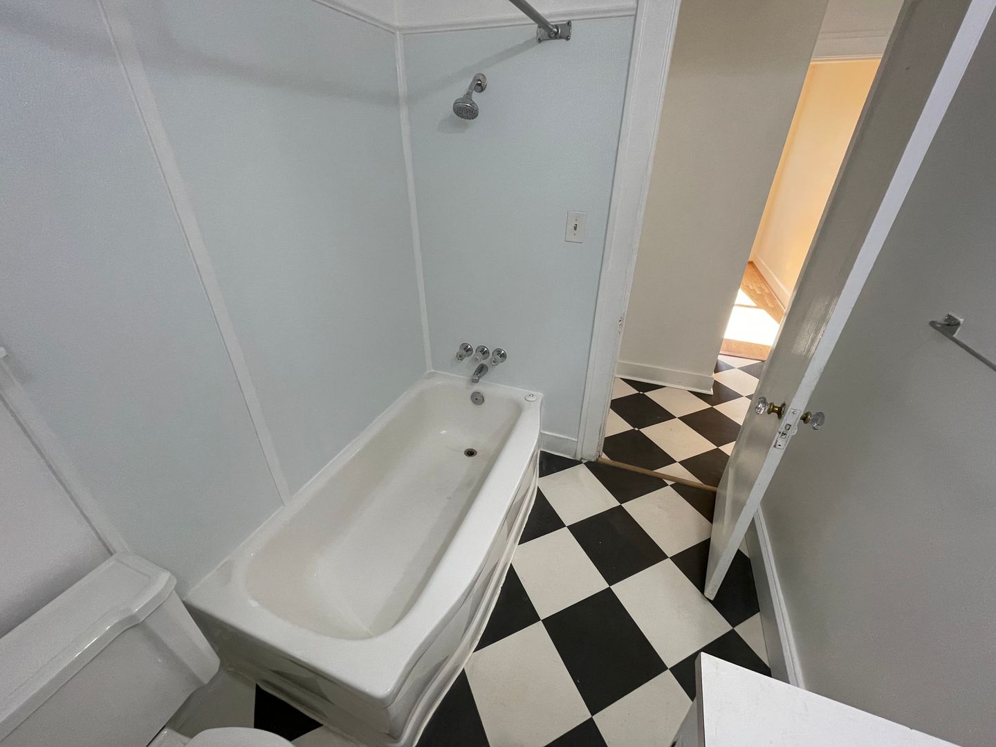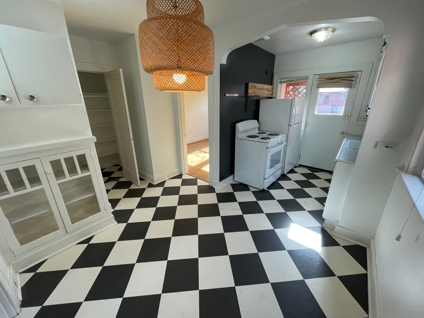 - Original hardwood floors in living and bedroom, and checkered flooring in dining, bathroom and kitchen