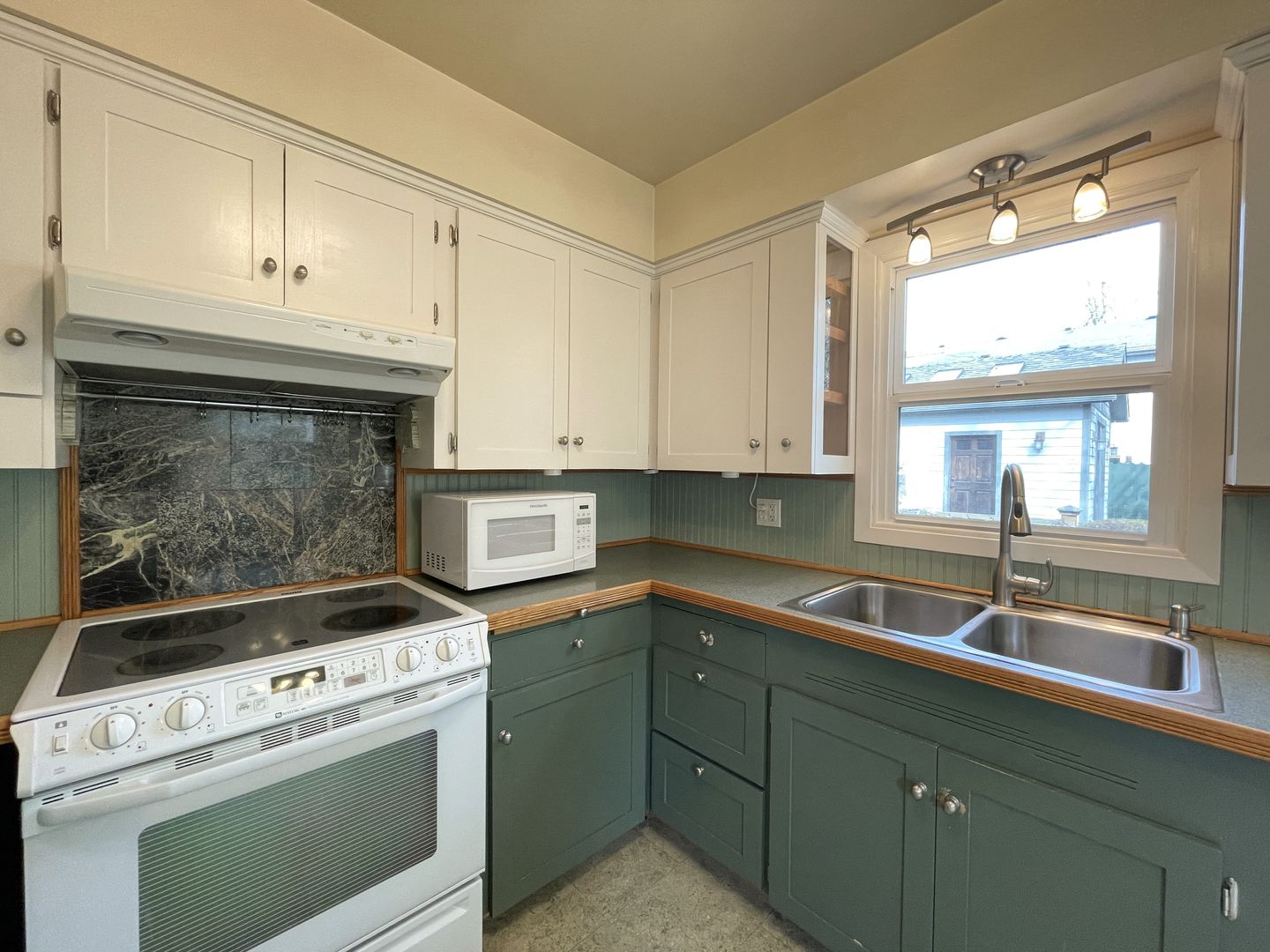 Bright kitchen with ample cabinet storage space plus a deep pantry. Kitchen appliances include a dishwasher, refrigerator, oven/range and microwave. French door off the kitchen leads to the outdoor space.